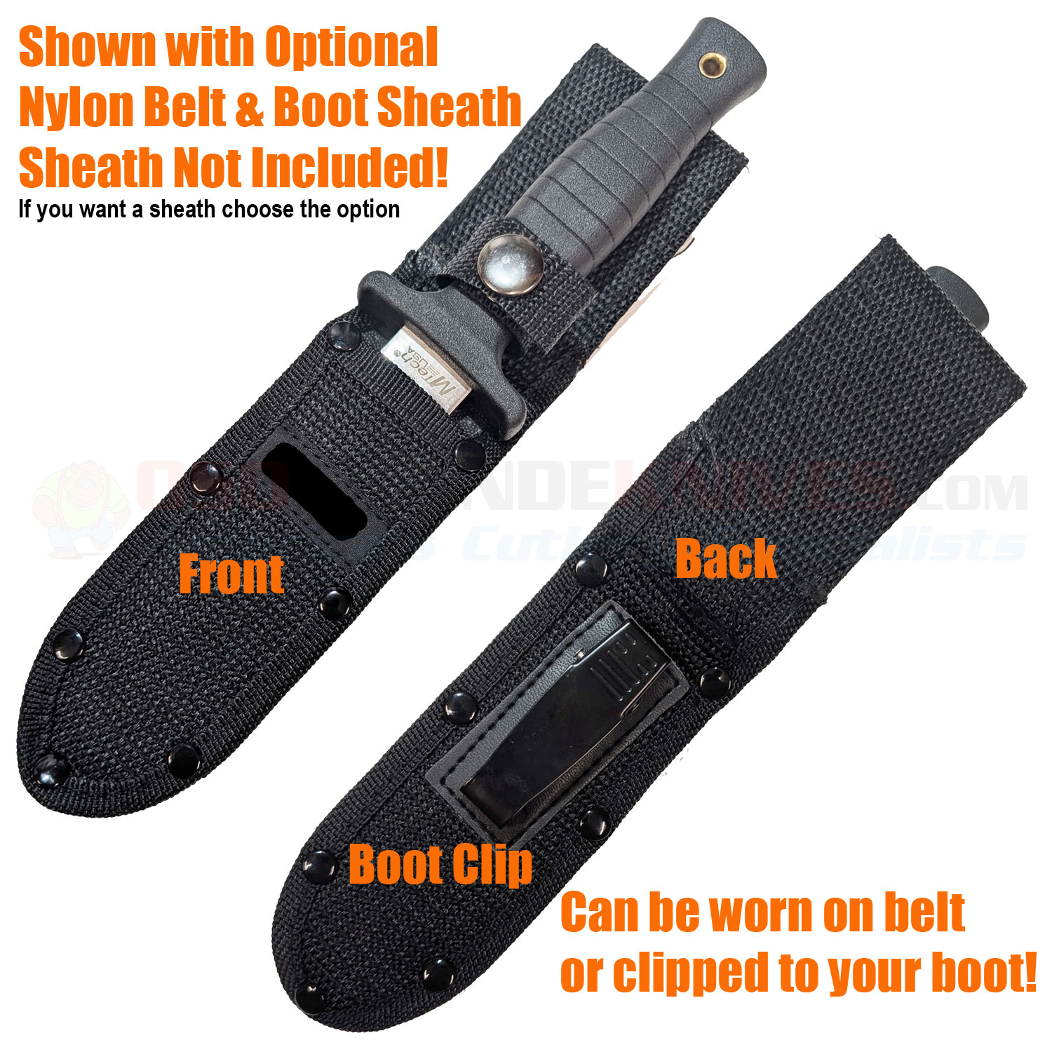 Premium Nylon Belt and Boot Sheath.This knife is sold WITHOUT a sheath but we have an excellent quality Nylon sheath that will allow you to securely carry your knife on either your belt or securely clipped to your boot. To purchase this optional sheath, please select the "Nylon Belt and Boot Sheath" option when adding the product to your cart.