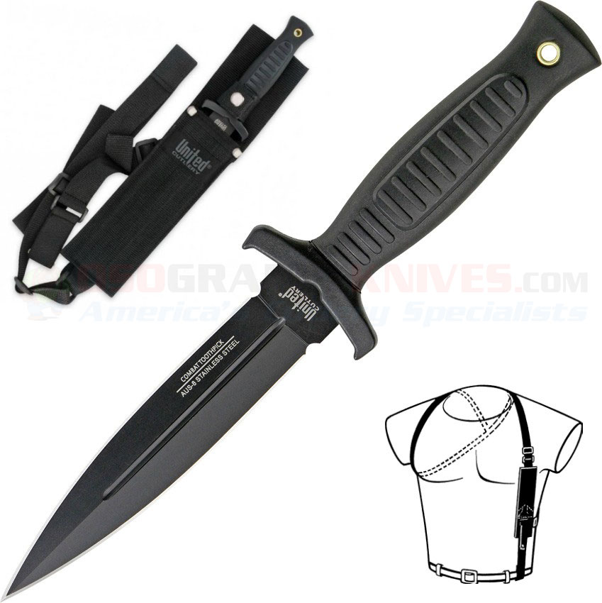 United Cutlery 2657 Combat Commander Knife, Black Double-Edge Blade. For fast, reliable protection whenever you need it, this United Cutlery dagger knife offers excellent concealment and strength in one small package. You'll be prepared for almost anything with this menacing black AUS8 stainless steel blade. The handle is constructed from injection molded impact resistant TPR with a brass lanyard sleeve. Includes shoulder harness sheath. Double-edged 5 1/4" blade, 9 1/2" overall. Handcrafted in China.