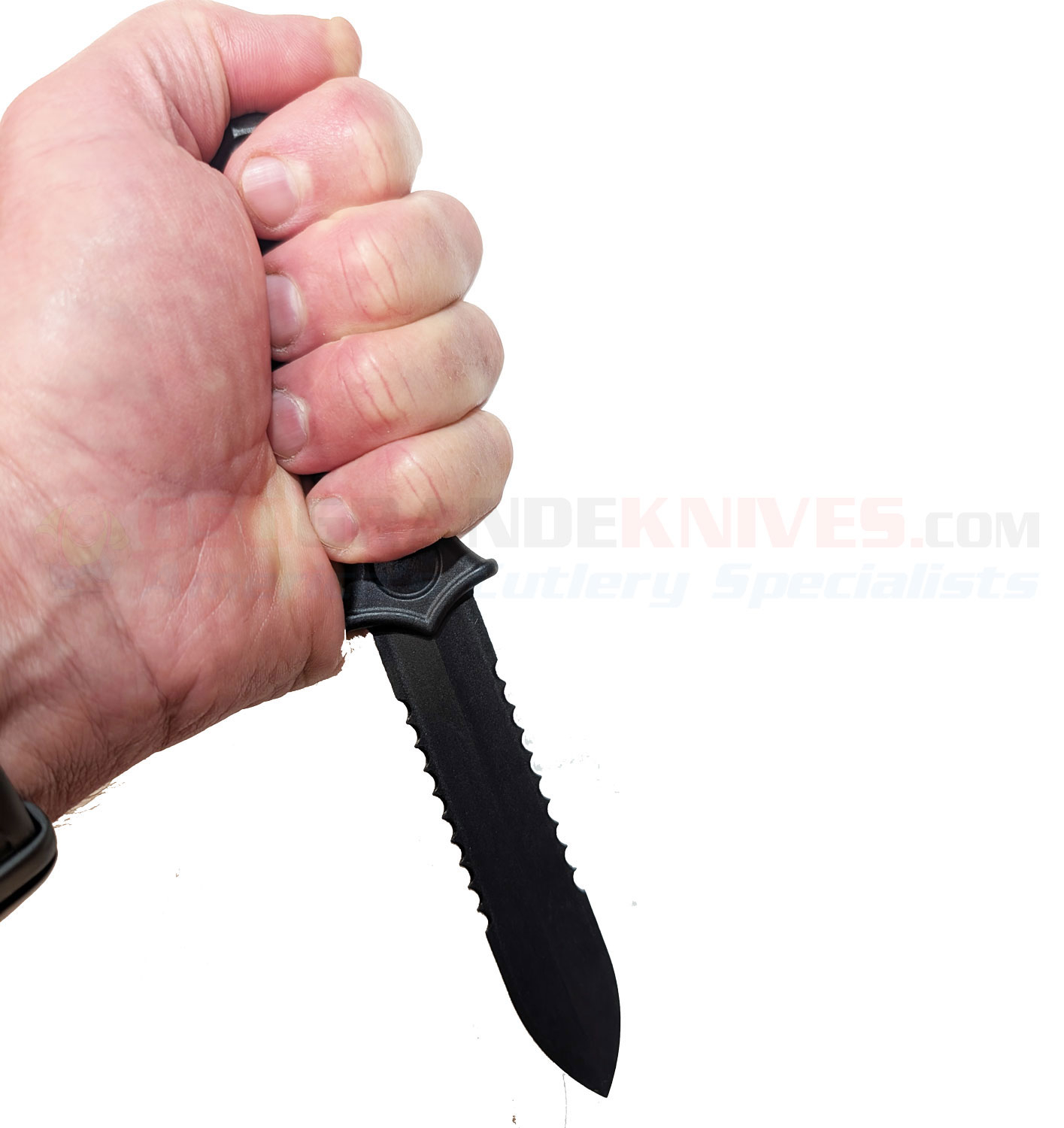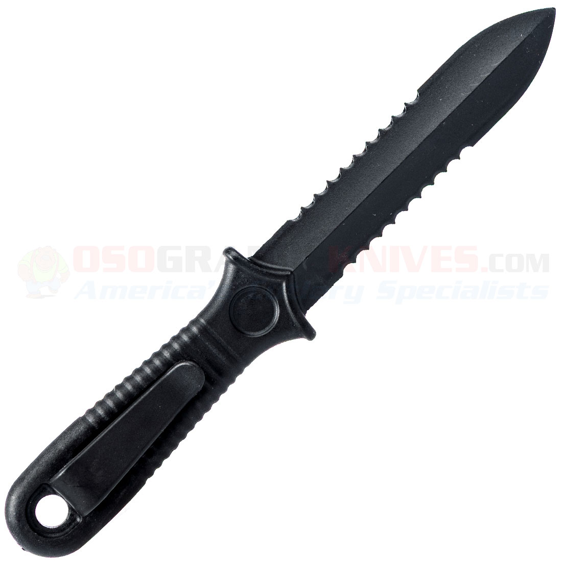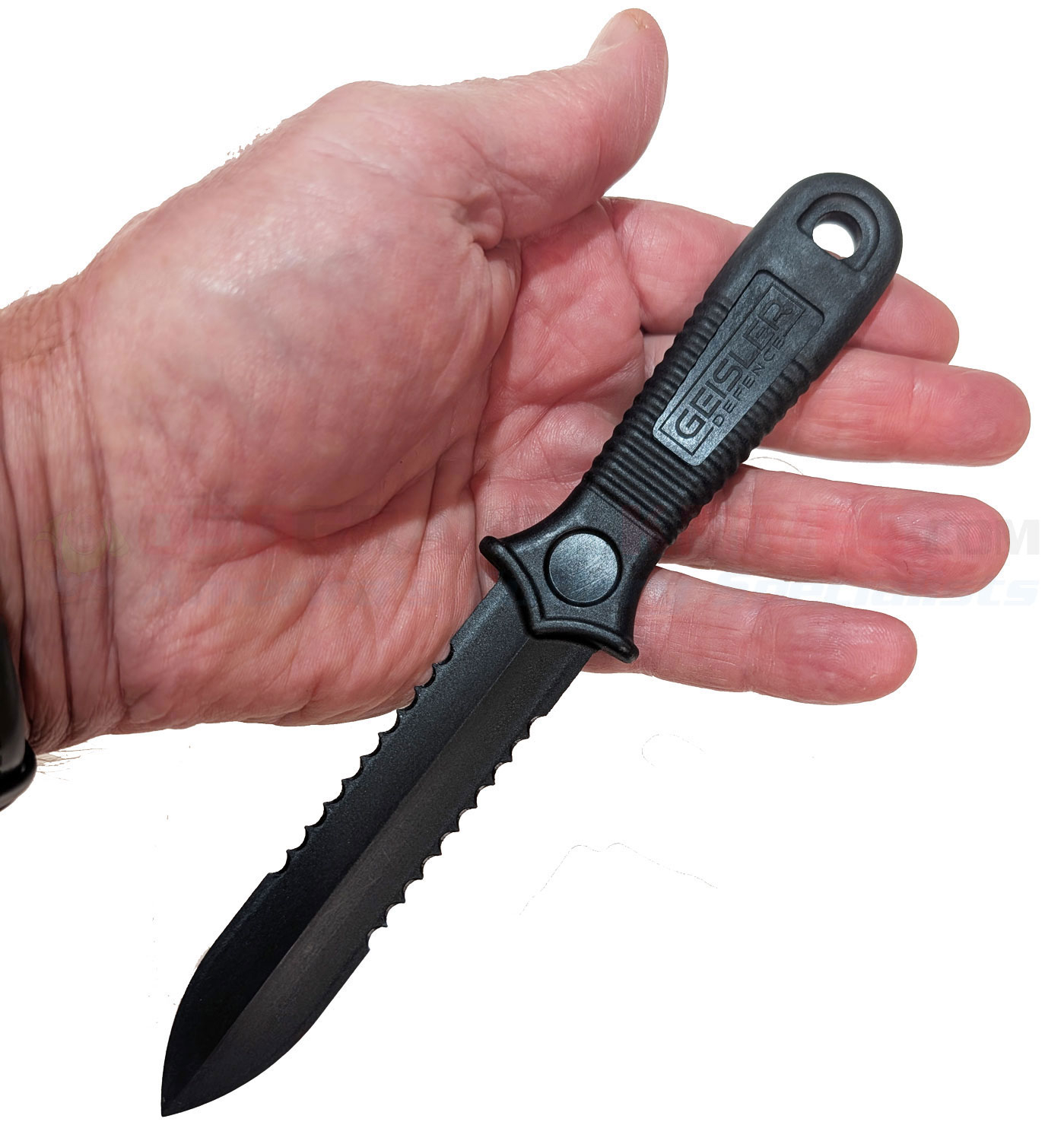 This Geisler Defense Long Kobe Boot Knife Dagger is constructed from a single piece of super tough industrial nylon. This high quality self-defense letter opener knife has dual sharp serrated edges which makes it very effective as a non-detectible self-defense weapon. This 100% non-metallic dagger is lightweight, sturdy, easy to conceal, and non-detectable by metal detectors such as the Garrett Wands. The removable pocket clip can be quickly mounted on the handle of this thermoplastic knife and that makes it easy to clip the knife to your pocket, waistband or clip it to your boot for quick access in an emergency. This non-metal boot knife measures 8 inches overall and has a 4.0 inch double-edge serrated spearpoint blade and a black industrial nylon handle with a lanyard hole. Proudly made in the USA.